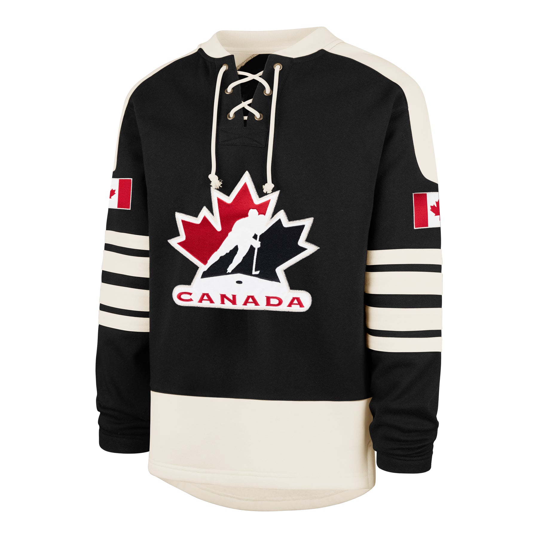 The '47 Sweep Check Lacer is a midweight fleece with felt appliqués, placket patches, drawcord, and twill tape.